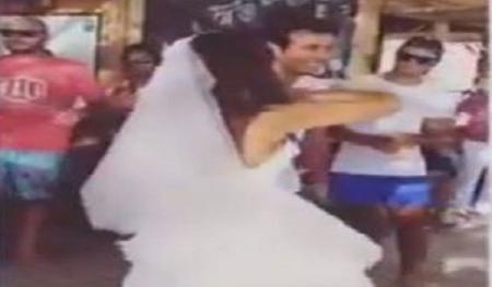 والأمر الأكثر غرابة أن الزوجة انصاعت لطلب زوجها بالتعري في مشهد مستنكر وغريب، حيث قامت بخلع فستانها أمام الكاميرات التي سُبطت عليها من قبل الحضور.